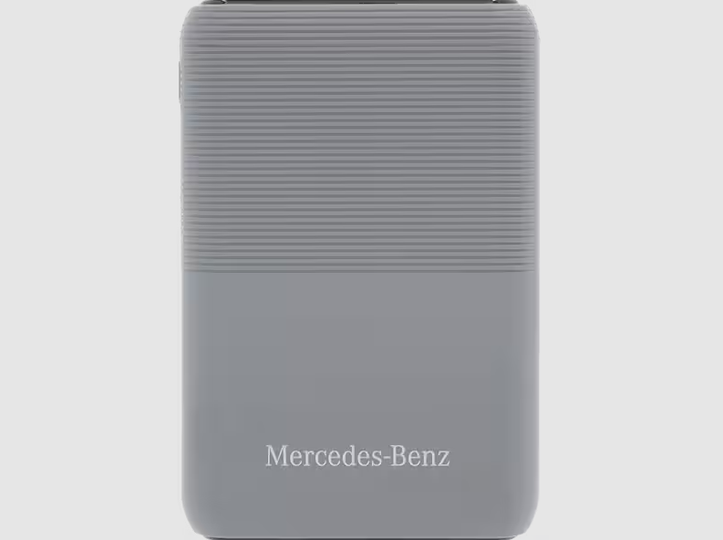 Para poder cargar la batería de forma rápida y eficiente fuera de casa, y para evitar que se apague el visualizador, el cargador portátil Powerbank ofrece una impresionante capacidad de 10.000 mAh. La batería de polímero de litio, protegida por una carcasa con recubrimiento antideslizante, se puede recargar en cinco horas mediante una conexión USB tipo C o USB micro B. Dos entradas USB tipo A, que se manejan mediante el interruptor de conexión y desconexión, permiten cargar simultáneamente dos dispositivos, cuyo proceso de carga se visualiza mediante cuatro indicadores LED. El Powerbank, que luce una estrella cromada en relieve en la parte delantera y una inscripción Mercedes-Benz impresa en la parte trasera, no deja tampoco nada al azar en cuanto a la seguridad, pues se desconecta automáticamente al finalizar la carga completa gracias a su función de protección contra sobrecarga y sobrecalentamiento.