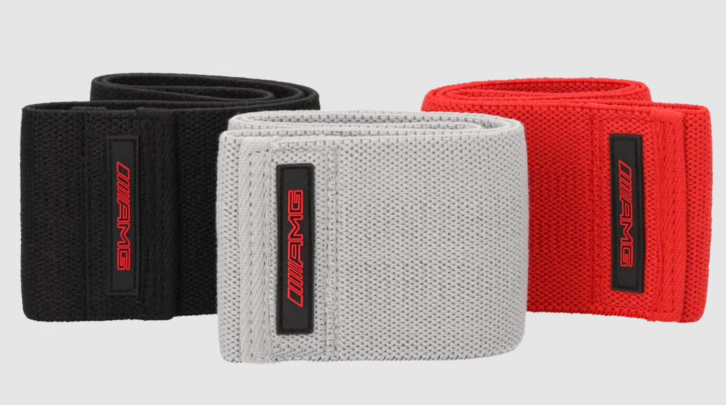 No importa si es en casa o en el gimnasio, da igual si se trata de sentadillas, patadas de burro o aperturas de mariposa: las bandas de fuerza AMG mejoran cualquier entrenamiento. Para ello, las bandas elásticas de un material textil agradable ofrecen tres niveles de resistencia diferentes (ligero = gris, medio = rojo, fuerte = negro) para adaptarse a todos los ejercicios y estados físicos. La resistencia de las bandas puede identificarse en la etiqueta cosida. Un emblema AMG de TPE sobrepuesto en 3D destaca el carácter deportivo de las bandas de fuerza. Para poder transportarlas fácilmente, las bandas vienen en una funda de poliéster con la impresión del contorno del logotipo AMG en rojo. La funda se cierra con un cordel y un tirador negros.